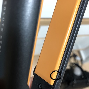 그래서 이상해서 꼼꼼히 자세히보니까 고데기 세라믹 판에 하얀색 흠집이 나있더라구요 보시면 검정색깔 동그라미친 부분쪽에 하얀색 점 하나가 있습니다.
